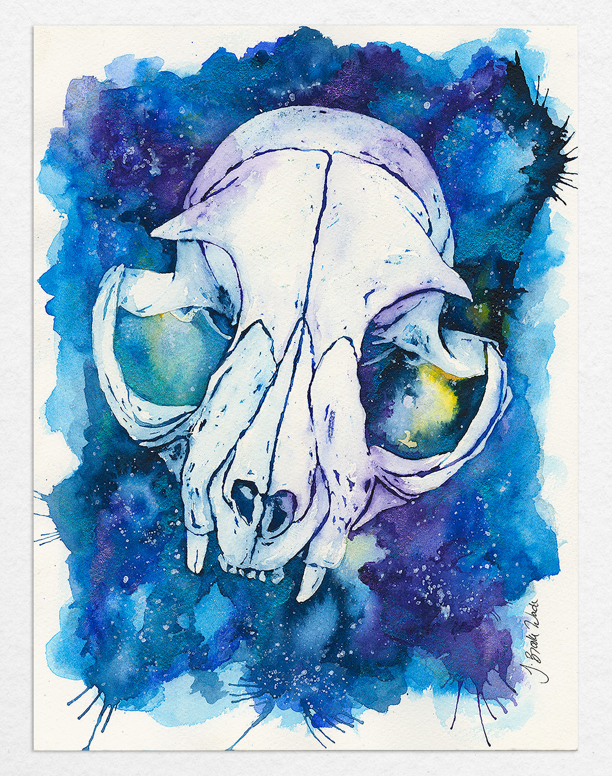 Ethereal and quietly powerful, this mixed media painting by J. Brooke Wade captures the mystery of life after death through a cosmic lens. At its center is a delicate cat skull, surrounded by vibrant nebulae of blue, violet, green, and gold — a swirling, celestial map of the soul’s journey beyond the physical world. The skull doesn’t feel morbid — it feels sacred, like a relic suspended in time, in the space where spirit and stardust meet.
