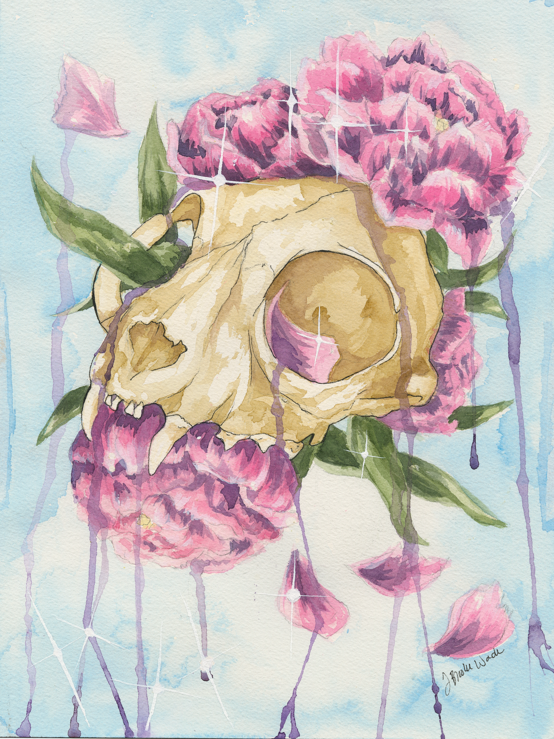 “Loss in Bloom: Bed of Petals" is a meditation on beauty born from what’s been left behind. At the center of the piece lies a delicate cat skull, cradled in full pink peonies—blooms at their peak, vivid and soft against the certainty of bone. Around them, subtle purple drips and glimmering illustrated sparkles create a sense of suspended time, as if the piece exists in that charged breath between farewell and transformation.