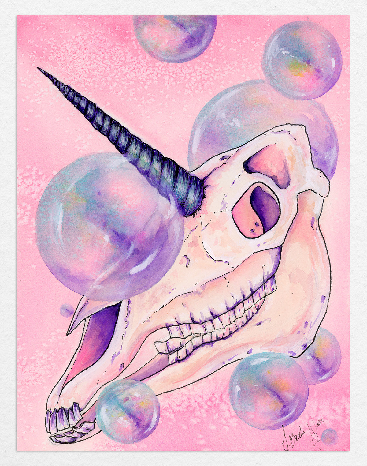 Painted by J. Brooke Wade, this piece leans into the surreal, blending whimsical fantasy with feminine gothicundertones. The skull, finely rendered in soft bone tones, stands out against the airy pink background, while iridescent bubbles create a sense of levity and stillness — as if the magic hasn’t disappeared, only changed form. It’s a gentle reminder that even the most mythical creatures meet their end, and even in death, beauty lingers.